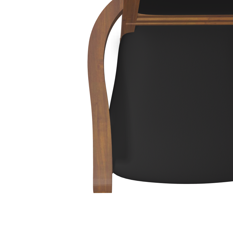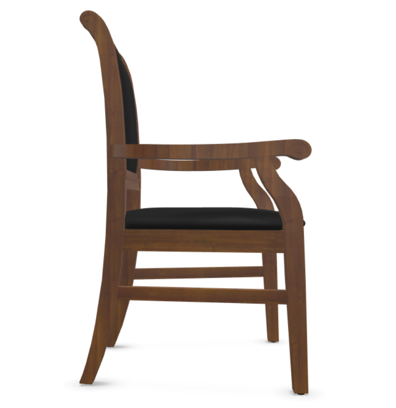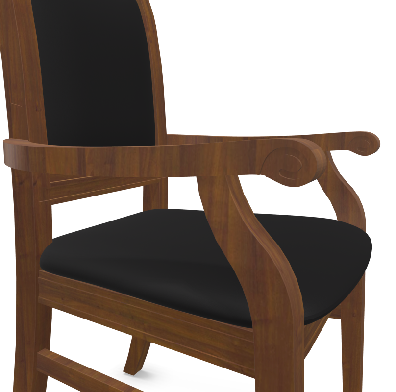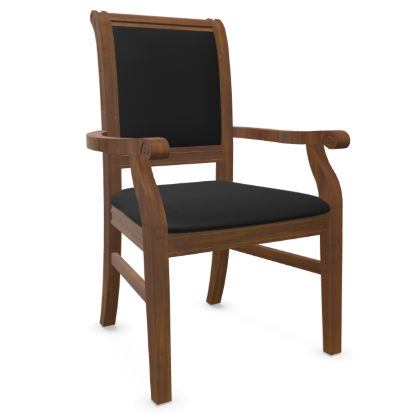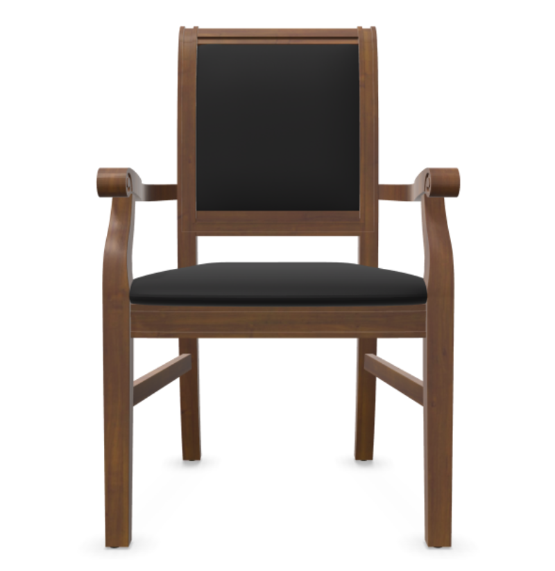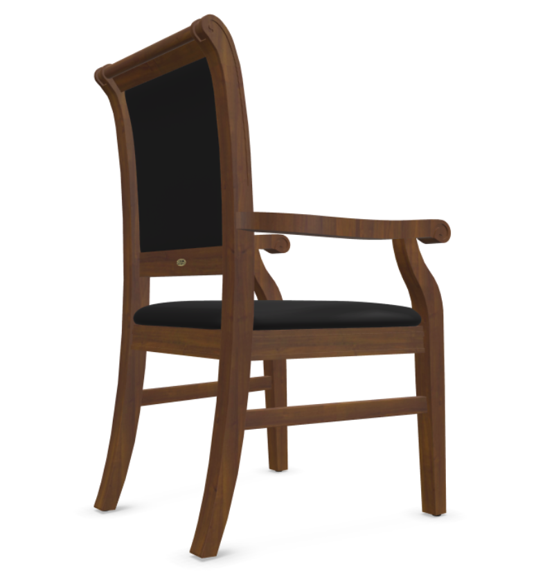 The Ambassador chair is a statement of elegance and sophistication, crafted from solid beechwood with a rich walnut finish. Designed for both comfort and prestige, this chair features a gracefully curved frame with intricate scroll armrests, adding a classic touch. The generously padded seat and backrest are upholstered in a sleek black fabric, providing a refined contrast against the warm wood tones.